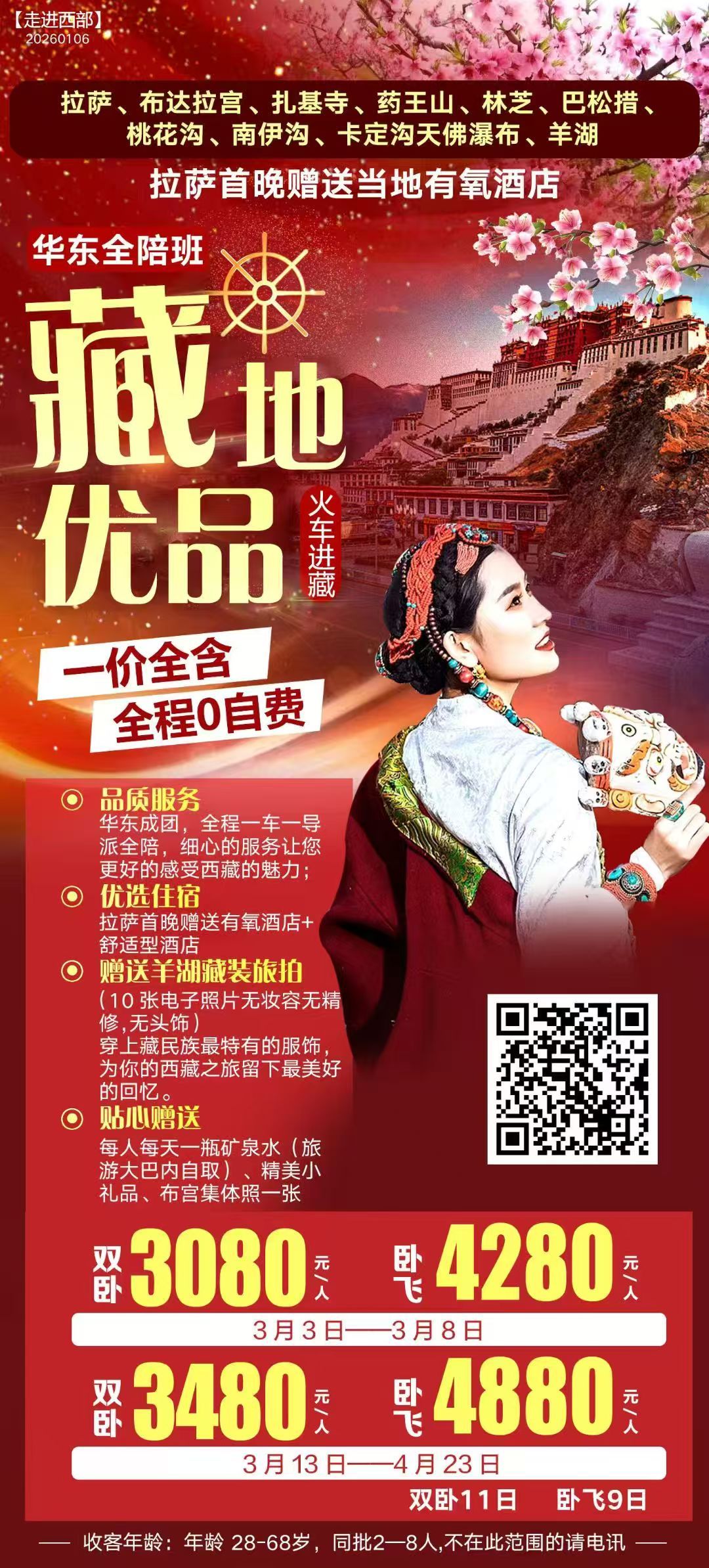 | ★双卧惠游:火车缓缓进藏,缓解高原反应,沿途欣赏祖国的大好河山美景; ★贵宾礼遇:拉萨导游献纯白哈达接站,享受贵宾礼遇; ★品质服务:华东成团,全程一车一导派全陪,细心的服务让您更好的感受西藏的魅力; ★优选住宿:拉萨首晚赠送有氧酒店+舒适型酒店 ★赠送羊湖藏装旅拍(10张电子照片无妆容无精修,无头饰) 穿上藏民族最特有的服饰,为你的西藏之旅留下最美好的回忆。 ★贴心赠送:每人每天一瓶矿泉水(旅游大巴内自取)、精美小礼品、布宫集体照一张; 温馨提示:行程中赠送项目如客人自愿放弃或人力不可抗拒的因素未参观, 费用不退! | |||||||||||||