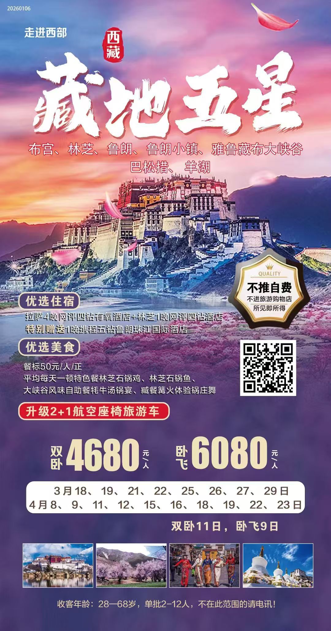 D6 | 林芝---藏民家访---巴松措--香巴拉礼赞 · 金马宴藏式火锅—拉萨 早餐后,我社特意赠送您体验藏族纯正的生活体验---【西藏民俗村】(参观时间约60分钟)。在莽原和雪山脚下,清澈的尼洋河边,巍峨的群山怀抱,有一座历经千年沧桑的小镇,对话历史,聆听民族融合的声音。之后前往【巴松错】(游玩时间约1小时)又名错高湖,可以“错高”在藏语中意为绿色的水,湖面海拔3700多米。湖形状如镶嵌在高峡深谷中的一轮新月,长约12公里,湖宽几百至数千米不等。 最深处66多米。总面积25.9平方公里。湖水清澈见底,四周雪山倒映其中,黄鸭、沙鸥、白鹤等飞禽浮游湖面。后乘车返回拉萨。参观香巴拉礼赞 · 金马宴藏式火锅:大型民族歌舞伴餐,沉浸式体验藏地风味,尽享高原牦牛精华! 温馨提示: 1、散团之后属于自由活动时间,无导游服务,请注意人身财产安全,如遇到任何问题,可及时联系我们的工作人员。 2、本日车程较长,较为辛苦,用餐时间不固定,建议随身携带一些零食以防不时只需。 3、景区内有藏族人自己生产的各类物品售卖,旅行社无法干预,请谨慎购买。 | 早/中/ 晚餐 金马宴藏式火锅 宿:拉萨 |