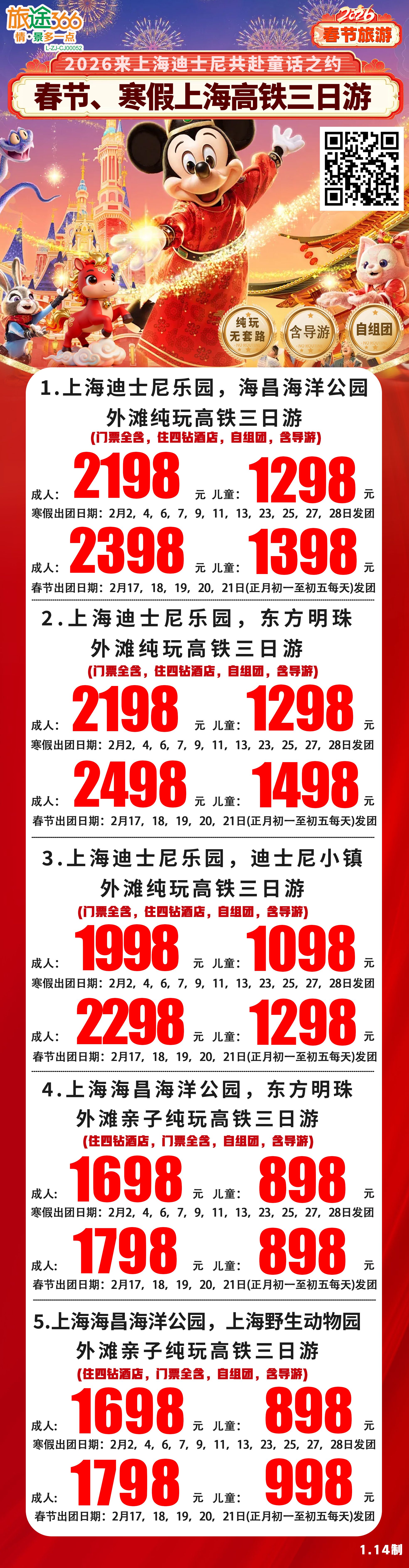 3)门票:景点首道大门票(含上海迪士尼乐园1天进园门票)