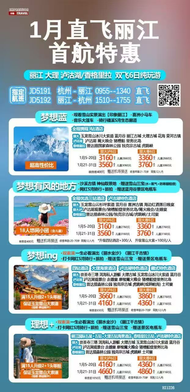杭州直飞丽江,搭配丽江+大理+香格里拉/泸沽湖等,欢迎小包团定制