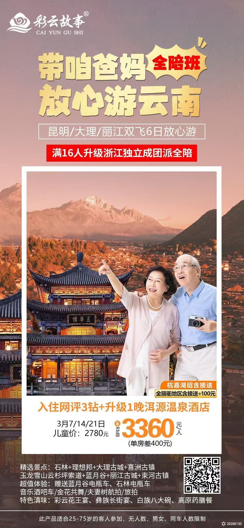 产品说明 | 1.此产品适合25-75岁的客人参加,无人数、男女、同车人数限制;单人补房差可收,云南属于高原地区,考虑到客人安全因素,70周岁以上客人必须有正常年龄客人陪同且70岁以上客人需要提供健康证明和免责协议; 2.由于产品操作的特殊性,在接团前24小时取消车位,收取车损为400元/人、第一天昆明房费200元/人; 3.此产品为高性价比放心产品,不安排进店,涉及到的景区内、餐厅若有购物点,与我社无关,请游客自行选择、自愿消费。 | ||
