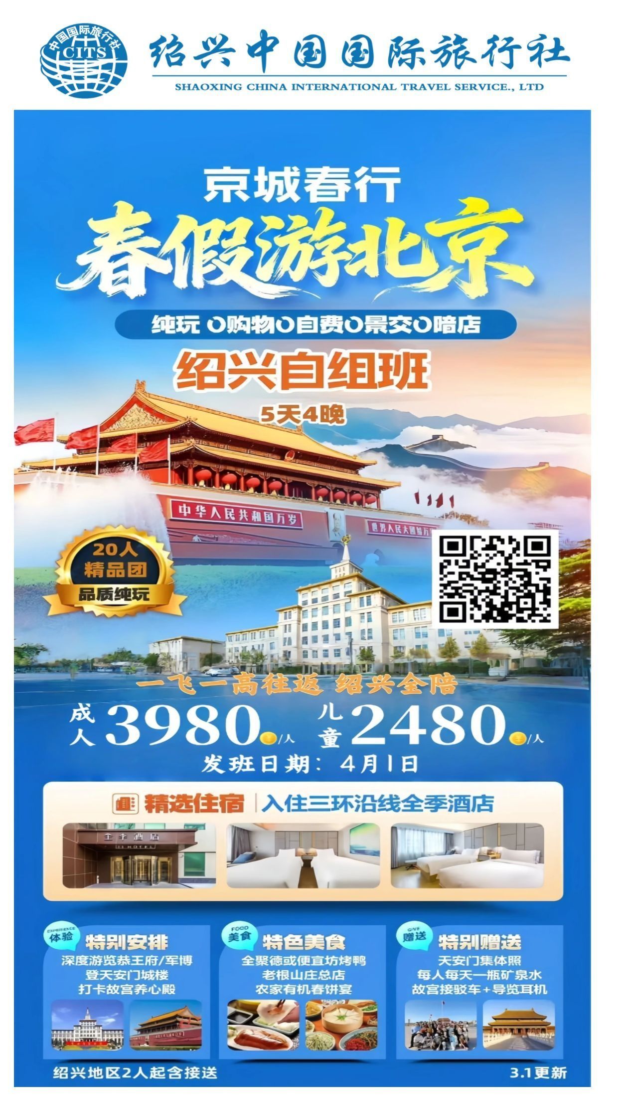 服务标准 | 1、交通:绍兴往返北京高铁二等座,飞机经济舱,北京当地为空调旅游车。 2、住宿标准:指定入住三环沿线全季酒店标准间/大床4 晚。单人住一间房需补其房差700元全程。 3、用餐: 4 早3正餐,其中一餐全聚德或便宜坊烤鸭 60 元/人,一餐老根山庄总店50元/人,一餐农家有机春饼宴 30元/人,10 人一桌,不足 10 人时菜数相应减少,但餐费标准不变。 4、门票:含行程中所列游览景点首道大门票,(包含天坛小门票,其它景区小门票不含) 5、导游服务:北京优秀导游服务 6、儿童价格适用范围:2-12 周岁以下儿童,儿童含车、半餐、导服、门票。不含床位,不含早餐