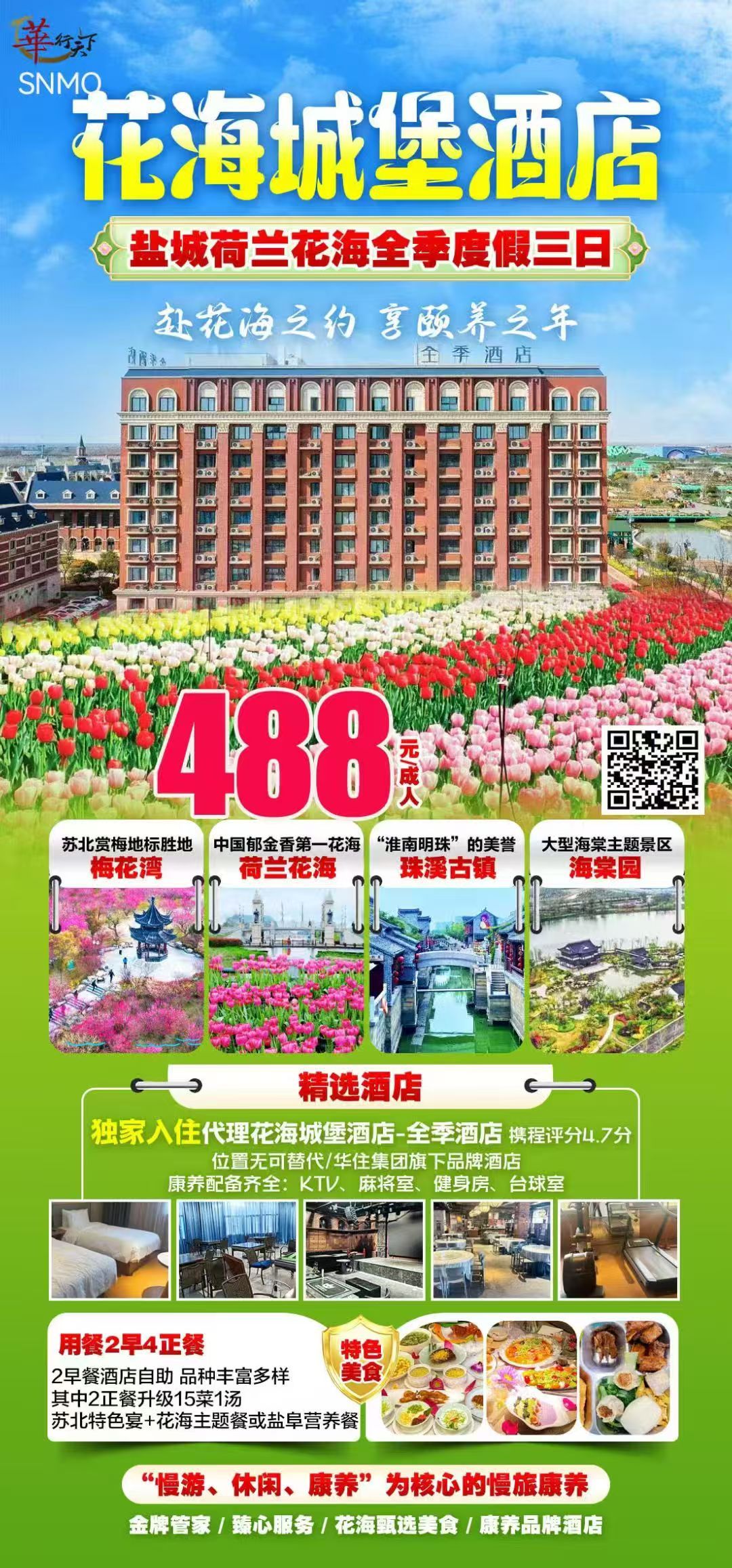 早餐后,深入游览【荷兰花海景区】(挂牌价50元,国家4A级旅游景区)。该景区依托1919年荷兰水利专家特莱克规划新丰农田水利的历史渊源,秉持“立足盐城、承接上海、辐射长三角”的功能定位,围绕地上长花、湖中生花、树上开花的整体规划,以郁金香为核心打造出国内连片种植面积最大、品种最多的郁金香花海,总面积达3000亩,涵盖300余品种、3000余万株。后乘车前往大纵湖景区,享用湖鲜午餐。餐后游览【湖塘花海】景区(此景点为赠送景点,花海有花期,不去不退费用),漫步千亩花海,打卡观景台,体验水上花田与小火车,自由拍照休闲。前往游览【大纵湖】(挂牌价60元,国家4A级旅游景区),位于江苏盐城市西郊大纵湖镇。大纵湖是里下河地区最大、最深的湖泊,享有苏中第一湖之美誉。度假区建有明末清初著名书法家宋曹的祖居、东汉末年文学家建安“七子”之一陈琳之墓、“扬州八怪”之一郑板桥的教书馆等景点。现正围绕“湖荡绿洲、渔家水寨、苏中明珠、度假天堂”的主题定位,将分三期建成集湖荡观光、休闲度假、民俗采风、生态教育、科考探秘等多功能于一体的生态型旅游度假区。晚餐后游览【东晋水城】景区位于盐城西南大纵湖旅游度假区内,与大纵湖国家湿地公园毗邻,东晋水城以宋式、民国建筑为骨架,配套新国风商业,包含三街、七河、九岛、二十四桥和两广场,一条主河道石梁河贯穿九岛,二十四座古桥将九座岛屿婉曲相连。可自由观赏【大纵湖山海奇幻夜景】,现场设置有近20组巨型山海经主题灯组,如“山海古道”、“精卫女神”、“天马行空”、“创世龙”等,这些灯组与古城建筑、湖光水色相融合,形成一步一景的光影画卷,营造出沉浸式的国潮秘境氛围。也可欣赏《九九艳阳天》水秀演出(周一或遇天气原因不演出),演出以《柳堡的故事》为蓝本,融合水幕、光影、喷泉与真人演艺,演绎红色年代里下河水乡的纯真爱情,经典旋律贯穿全场,视听震撼、情怀满满。结束返回酒店入住!