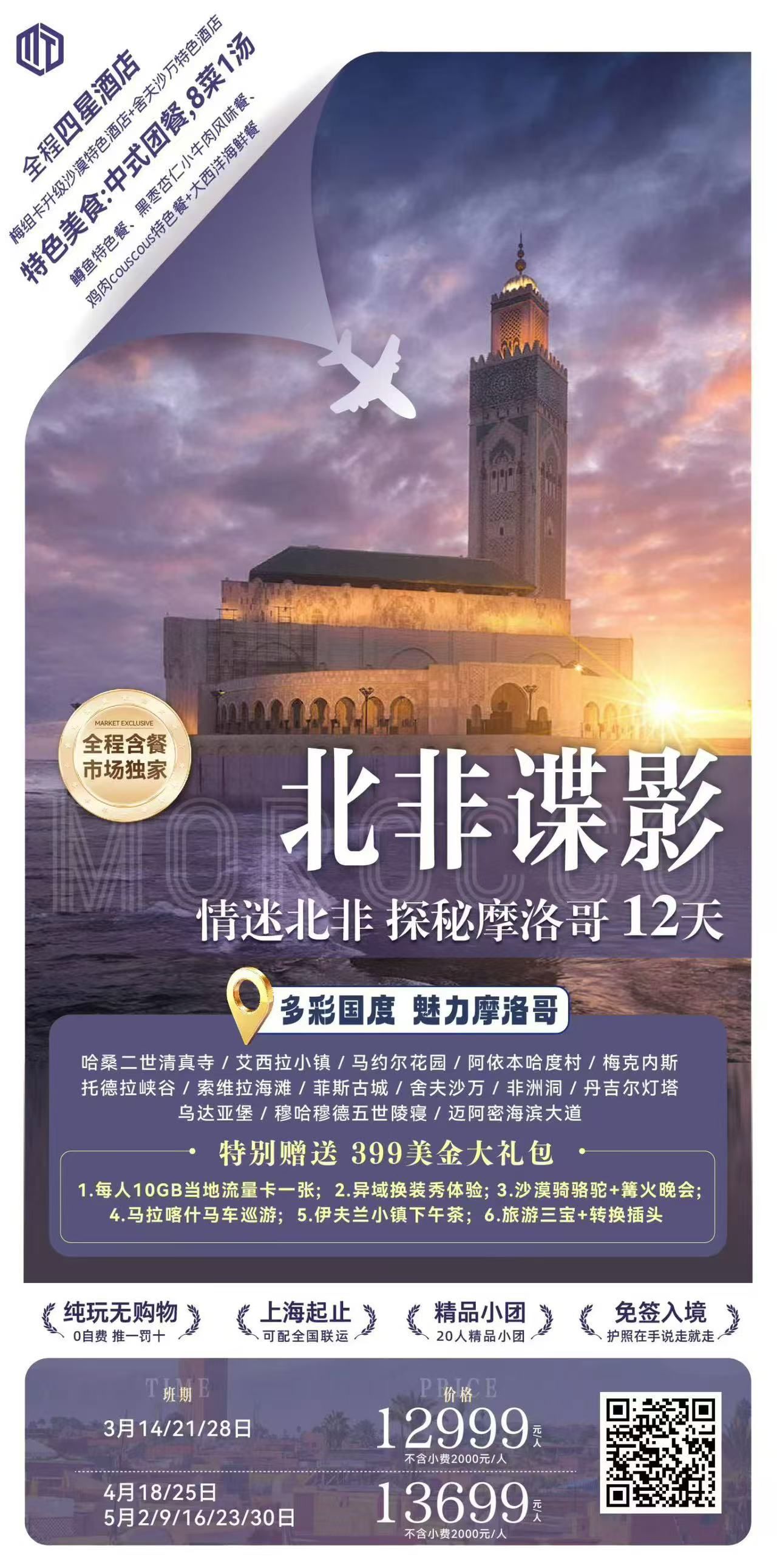 1. 上海-摩洛哥往返国际机票团队经济舱,含机场建设税;