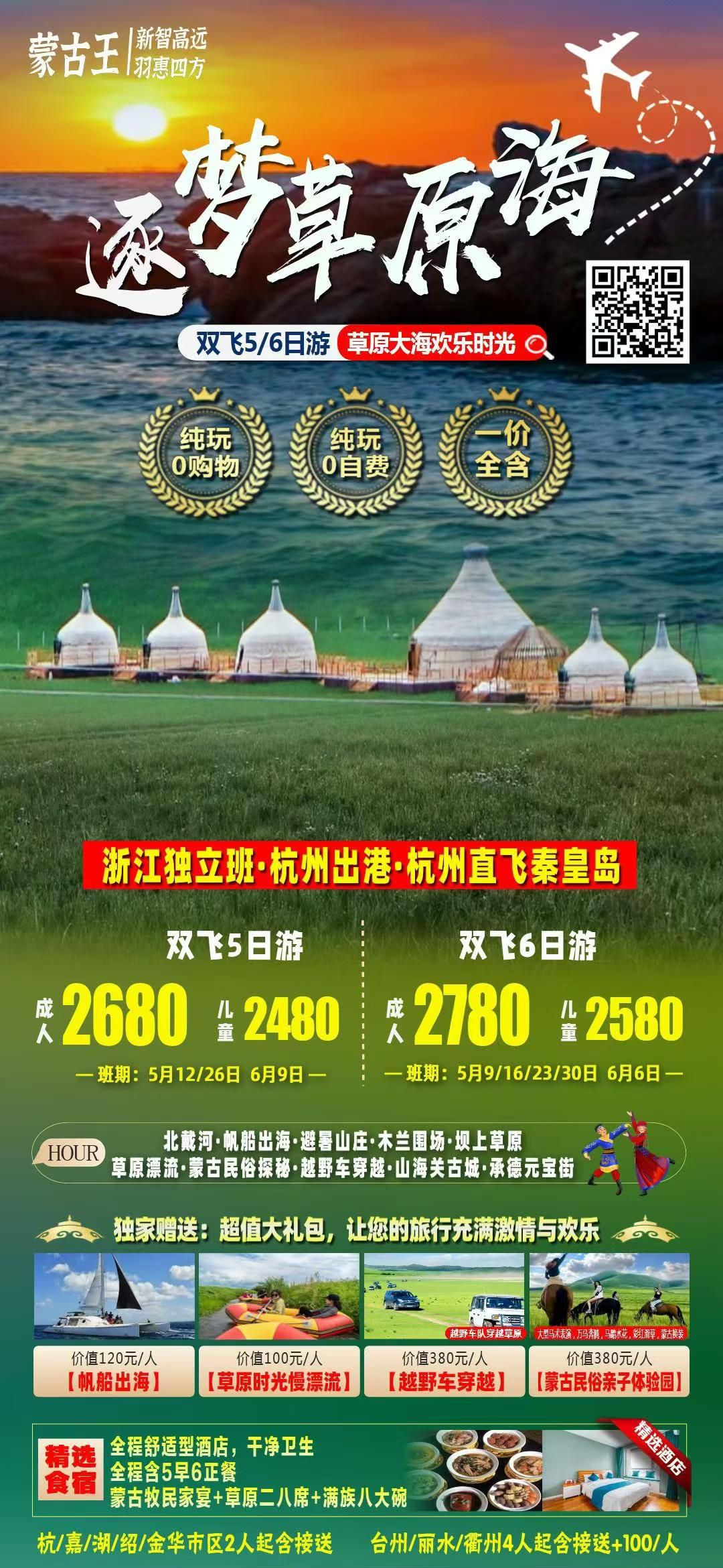 上午:早餐后乘车赴【塞罕坝森林公园】,有“中国绿色明珠”和“华北绿宝石”之称,是华北地区面积最大、兼具森林草原景观的国家级森林公园,风光绚烂多彩,是摄影家的天堂。这里独特的气候与悠久的历史,造就了这里特殊的自然景观和人文景观,风景如诗般醉人,美不胜收。 中午:品尝草原农家饭 下午:【追梦坝上草原·草原大型娱乐套票】(套票已含,游览时间约2.5小时) 漫步草原-木兰秋狝狩猎-敖包祈福-蒙古搏克表演-网红七彩滑草-训鹰表演-草原艺人表演-蒙古族换装拍照-萌宠乐园…… 【马术表演】蒙古族的姑娘小伙子,在马上飞驰,时而站起时而倒立,精彩刺激! 【骏马奔腾、马踏水花】辽阔草原,骏马呼啸而来,马蹄声声,划破空旷宁静,气势震撼人心,壮怀激烈 晚上:抵达【草原度假村】,体验最具蒙古特色的欢迎仪式,草原民族最高的迎宾礼节 『下马敬酒』蒙古族漂亮的姑娘和小伙穿着他们节日的盛装,手捧银碗,载歌载舞迎接草原 尊贵的客人; 『敬献哈达』用草原上象征高贵的哈达为客人献上来自草原的祝福; 『草原祝福』献上草原人民对贵宾最衷心的祝福,敬天、敬地、敬祖宗,感谢长生天赐予丰 厚的食物。 【燃燃篝火耀草原,激情嗨翻星空夜】(赠送项目,如遇草原防火期/下雨,则取消,不退任何费用)夜幕降临,群星闪耀,明月当空,围着篝火,跟随热烈的歌舞表演,赴一场篝火之约,在夜晚的草原伴随着微醺的晚风下挽手共舞,一起丢掉生活繁杂的琐碎,尽情投入其中,熊熊的焰火不仅能点缀黑夜,更温暖着每一个人的心。 【温馨提示】: 1、草原酒店设施一般,草原地区经济落后,牧民文化水平较低,如果没有达到您的预期,不喜勿喷,以免伤害当地牧民的感情。 2、此日承德到坝上全程车程需4小时左右,如您要晕车,请务必携带晕车药。旅游旺季车辆增多,有可能会堵车,导致用餐时间较晚,敬请理解。 | ||||